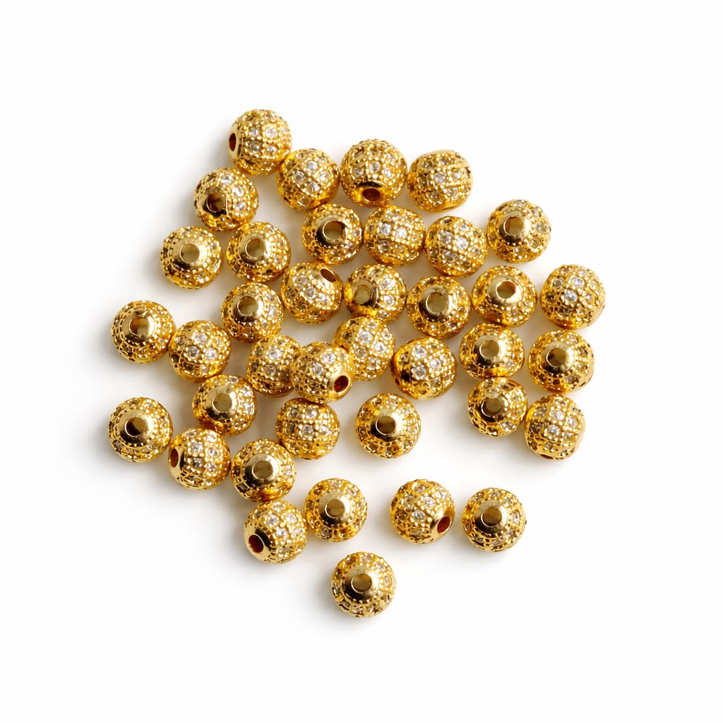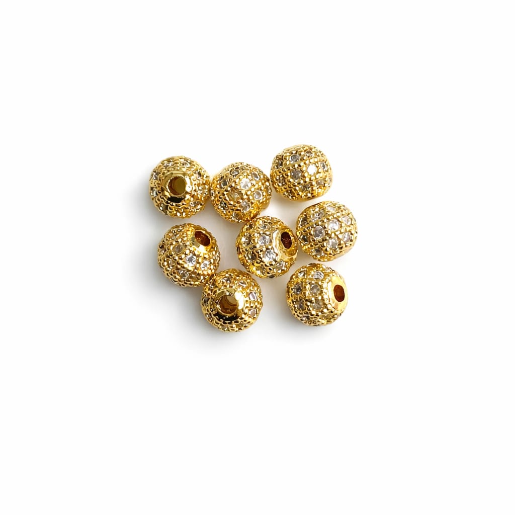Gold plated AD balls with sparkling American Diamonds. Smooth hole for easy stringing, lightweight, durable and perfect for bridal and designer jewellery making.