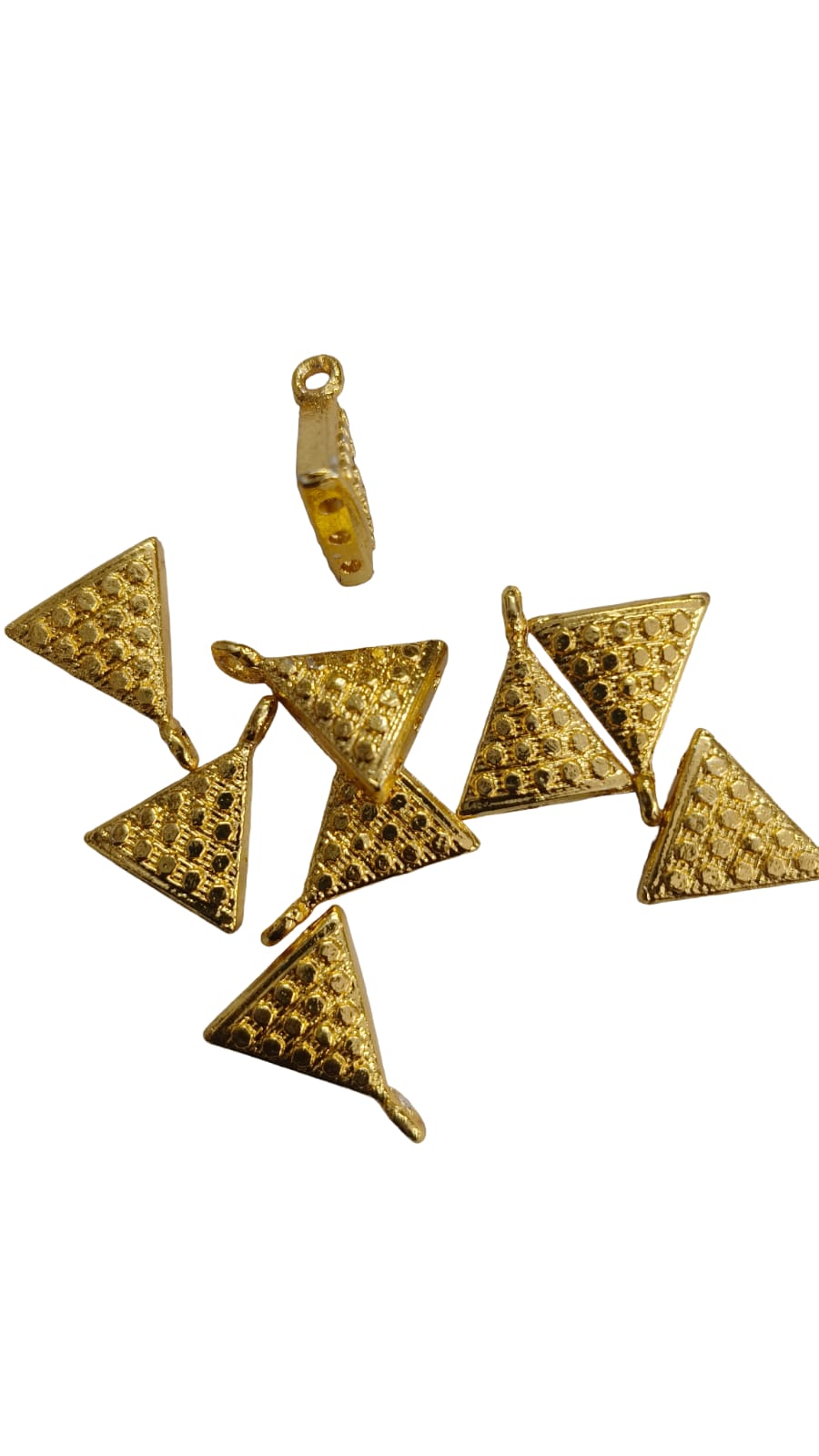 This gold plated triangle charm pendant features a unique textured geometric design that adds a modern and stylish touch to handmade jewellery. The attached loop makes it easy to connect with chains, hooks, or jump rings, making it perfect for DIY jewellery projects. Ideal for creating earrings, pendants, bracelets, and trendy accessories, this charm offers a premium finish with long-lasting shine. Lightweight yet durable, it is suitable for both beginners and professional jewellery makers.
