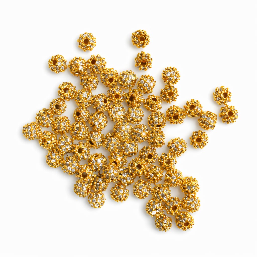 Designed with a smooth center hole for easy stringing, these AD balls are perfect for creating elegant bridal, festive, and designer jewellery pieces. The high-quality gold plating ensures a real gold-like finish, making them ideal for traditional as well as modern jewellery designs.
