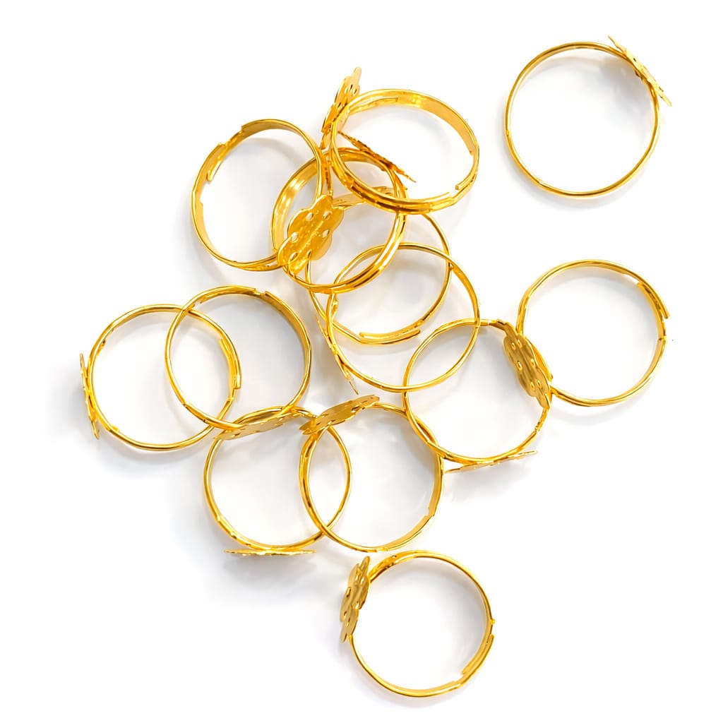 Create your own designer rings with this high-quality Gold Plated Adjustable Ring Base featuring a flower-shaped flat pad. The sturdy metal base comes with an adjustable band, making it suitable for different finger sizes.