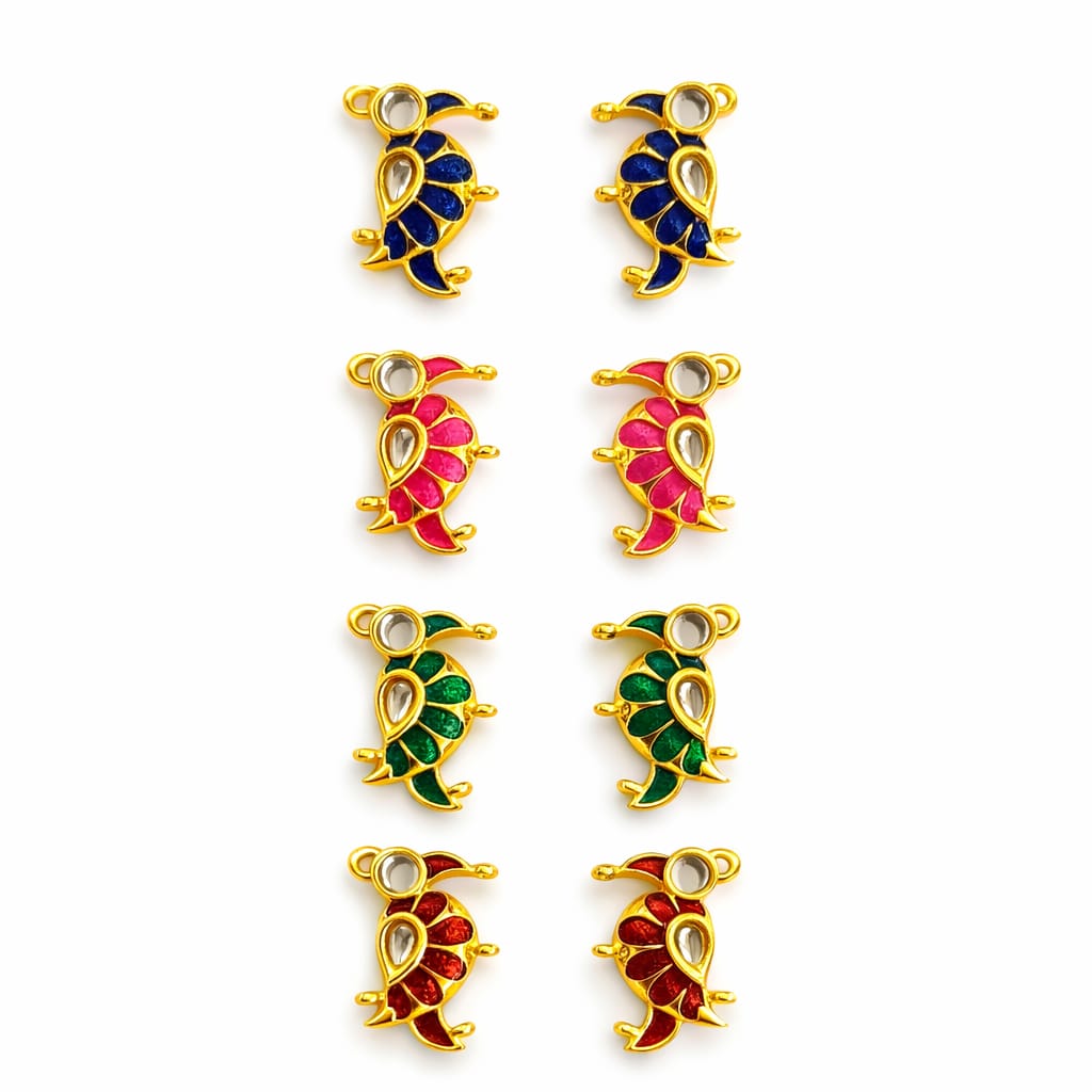 Enhance your jewellery designs with these elegant Parrot Shape AD Kundan Connectors. Crafted with a premium gold-plated finish, these beautifully detailed pieces feature vibrant enamel colors like Blue, Pink, Green, and Red, paired with sparkling Kundan stones for a rich traditional appeal. The unique parrot design adds a stylish and ethnic touch, making them perfect for creating earrings, pendants, bangles, and Kolhapuri saaj jewellery. Durable, lightweight, and easy to use—ideal for both professional and DIY jewellery makers.